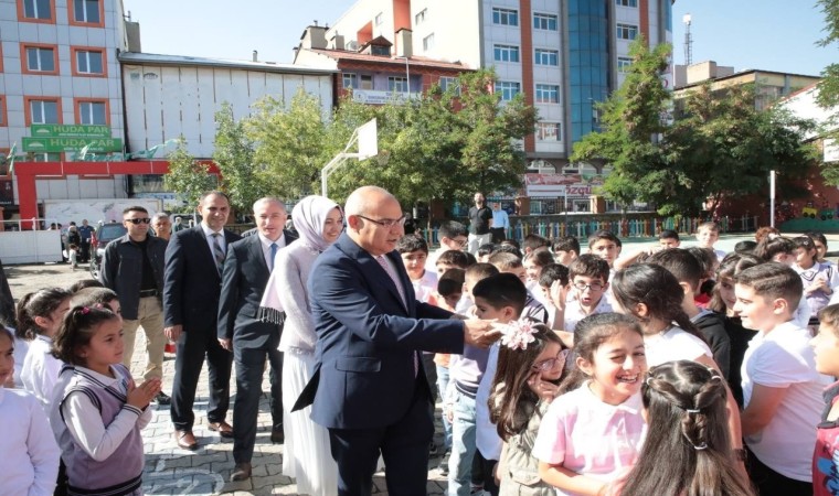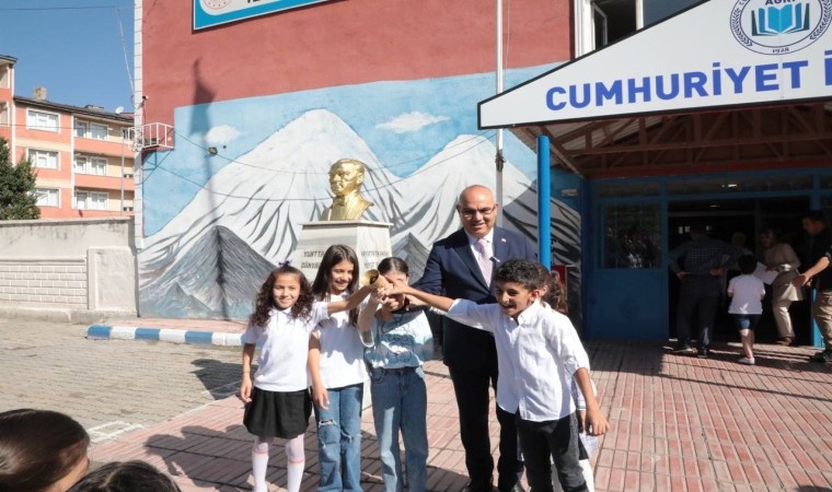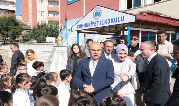 Vali Koç, "Bugün ülkemizin her yerinde olduğu gibi serhat şehrimiz Ağrı’da da 2024-2025 eğitim-öğretim yılının ilk ders zilini çalmanın heyecanını yaşıyoruz. Okullarımızı cıvıl cıvıl görmek bizi mutlu etti. Yavrularımızın heyecanından da onların da okullarını ve öğretmenlerini özlediğini gördük. Eşimle birlikte onların heyecanına ortak olalım, mutluluklarını paylaşalım diye bugün buradayız" ifadelerini kullandı.