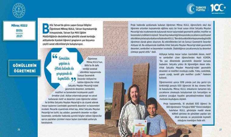 Sosyal Bilgiler Öğretmeni Mihraç Kulu’nun Bitlis’te 2014-2022 yılları arasında yaptığı projeler de MEB’in Cumhuriyet’in 100. yılına özel "Maarifin Yüz Akı" e-dergisinde ilk 20’ye giren öğretmenlerin ilham verici uygulama örnekleri arasında yer aldı. Milli Eğitim Bakanlığından (MEB), yapılan açıklamaya göre, MEB Strateji Geliştirme Başkanlığınca yayımlanan "Maarifin Yüz Akı" e-dergisinde, yenilikçi çözümler üreten, hayal gücü sınır tanımayan öğrenci ve öğretmenlere ait başarı hikayeleri, fark oluşturan proje çalışmaları ve ilham verici uygulama örnekleri yer aldı. Bakanlığın merkez ve taşra teşkilatı birimleri ile birlikte hareket edilerek toplam 10 binin üzerinde iyi uygulama incelendi. Türkiye’nin tüm illerinden, farklı branş ve kademelerden öğretmen kategorisinde 20, öğrenci kategorisinde 54 ve eğitim kurumları kategorisinde 26 çalışma olmak üzere toplam 100 iyi uygulama örneğine yer verildi. 2014 ile 2022 yılları arasında Bitlis’in Tatvan ilçesinde görev yapan Sosyal Bilgiler Öğretmeni Mihraç Kulu’nun, 2021 yılında Ahlat Selçuklu Meydan Mezarlığı’ndaki tarihi mezar taşları üzerinde bulunan motiflerden yola çıkarak uyguladığı ‘Sonsuz Geometrik Desenler Atölyesi projesi ve 2016 yılında köy çocuklarını sinemayla buluşturduğu ’Tarihe Yolculuk’ projeleri ilham verici uygulama örnekleri arasında ilk 20’ye girdi.