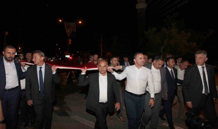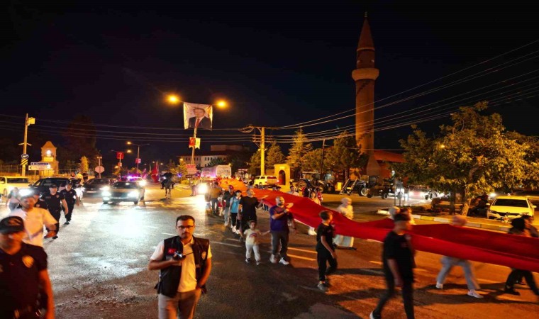 Kaymakamlık önünde toplanan ve 200 metre uzunluğunda Türk bayrağı açan kalabalık, mehteran takımı ve atlı birlikler öncülüğünde Selçuklu Çarşısı meydanındaki konser alanına kadar yürüdü.