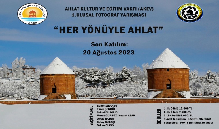Ahlat Kültür ve Eğitim Vakfı (AKEV) tarafından düzenlenen ve Ahlat Fotoğrafçılar Derneği (AHFOD) işbirliği yürütülen “Her Yönüyle Ahlat” konulu fotoğraf yarışmasının son başvuru tarihi 20 Ağustos 2023 olarak belirlendi. İslam tarihinin en önemli miraslarından Anadolu’nun Orhun Abideleri olarak da bilinen ve dünyanın en büyük Türk-İslam Mezarlığı olan Ahlat Selçuklu Meydan Mezarlığı; tarihi kümbetler, mağara evler, hamamlar, kaleler, köprüler gibi birçok tarihi ve doğal güzellikleri içinde barındıran Ahlat ilçesinde ilk defa düzenlenecek ulusal fotoğraf yarışmasında amacının ilçenin tanıtımına katkı sunmak olduğu belirtildi.