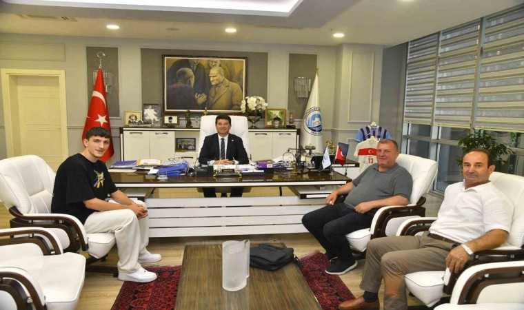 Trabzonspor altyapısından yetişen ve Hollanda’nın Ajax takımında forma giyen milli futbolcu Ahmetcan Kaplan, aynı zamanda Boztepe Mahallesi Muhtarı da olan babası Yücel Kaplan’la birlikte Başkan Kaya’yı ziyaret etti. Milli futbolcu, Almanya’da düzenlenen Euro 2024 Avrupa Futbol Şampiyonası son 16 turunda oynanan Avusturya maçında giydiği formayı imzalayarak Başkan Kaya’ya hediye etti.