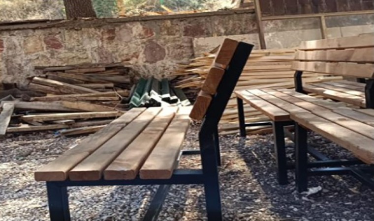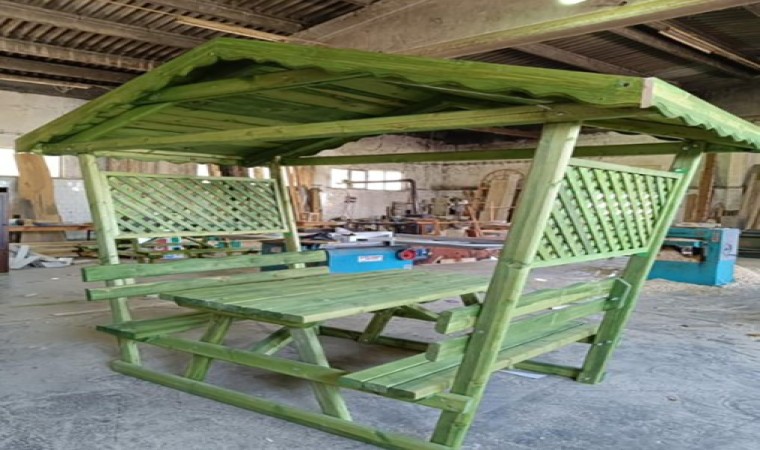 Bilecik’in Osmaneli ilçesinde ahşap atölyesinde çalışan görevliler bank, çardak ve masa üretimine devam ediyor.