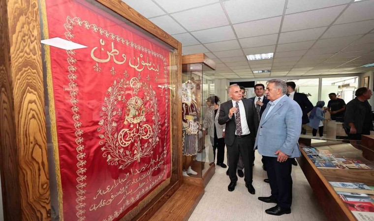 Denizli’ye bir dizi program ve ziyaret için gelen AK Parti Siyasi ve Hukuki İşlerden Sorumlu Genel Başkan Yardımcısı Hayati Yazıcı, Büyükşehir Belediye Başkanı Osman Zolan’ı ziyaret etti. Başkan Zolan belediye binası önünde karşıladığı Genel Başkan Yardımcısı Yazıcı’ya Büyükşehir Belediyesi Kültür ve Sosyal İşler Dairesi Başkanlığı’nda sergilenen ünlü Yatağan Palası, Büyükşehir Belediyesi Kültür Yayınlarından oluşan eserleri ve Denizli Sancağını anlattı. 15 Mayıs 1919’da Müftü Ahmet Hulusi Efendi’nin Denizli Sancağı ile ilk direnişi başlattığından bahseden Başkan Zolan, Denizli’nin düşman işgaline uğramadığını kaydederek sancağın 15 Temmuz 2016’da da meydanlarda dalgalandığını ifade etti.