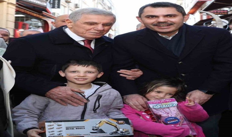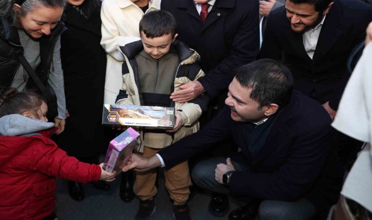 Bir çocuğa oyuncak kepçe hediye eden Kurum, "Bununla İstanbul halkının sorunlarını çözmek için çalışacaksınız. Metrolar yapacaksınız" dedi.