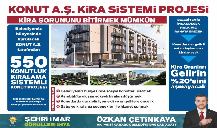Çetinkaya, seçilmeleri halinde görev süreleri boyunca 2 bin 100 adet konut yapacaklarını bildirdi. Konutların ilk olarak Adatepe, Kartaltepe, Fevzi Çakmak, Kayabaşı, Namık Kemal, Soğuksu, Yeni ve Kurtuluş mahallelerinde yapılmasının planlandığını ifade eden Çetinkaya, "2100 adet Karabük’e konut kazandıracağız. İlk 5 yılda, bunun üstü olur altı olmaz. Burada öncelikli mahallelerimiz Adatepe, Kartaltepe, Fevzi Çakmak, Kayabaşı, Namık Kemal, Soğuksu, Yeni Mahalle, Kurtuluş gibi değişime, gelişeme ihtiyaç duyulan mahalleler. Deprem fay hattı şehrimizin 40 kilometre yakınından geçiyor. Bu depreme dayanıksız kısmı var, ayrıca şehre baktığımız hemşehrilerimiz 95 ve daha eski binalarda oturması açıkçası bizim vicdanımız el vermiyor. Depreme dayanıklı, modern yaşam alanları üretmeye başlayacağız. Burada Karabük’ün ihtiyaçları belli, yeni konuş stoğunu artırmak, daha modernize etmek, bunları bizler üreteceğiz. 1+1, 2+1, 3+1 olmak üzere şuan ki planlarımız ve maliyetler çerçevesinde 1,5 milyon ile 1 milyon 900 bin TL arasında halkımızın hizmetine sunacağız" dedi.