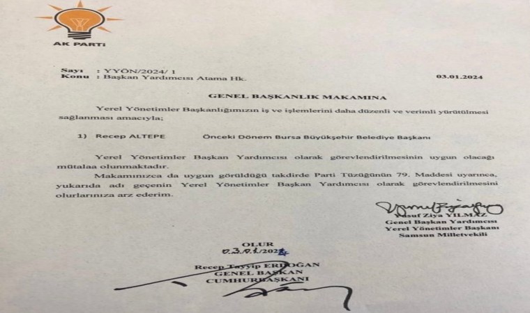 Bursa Büyükşehir Belediyesi başkanlığı görevini 30 Mart 2009 - 23 Ekim 2017 tarihleri arasında yürüten Recep Altepe, Cumhurbaşkanı Recep Tayyip Erdoğan’ın isteği üzerine istifa etmişti. 31 Mart 2024 Pazar günü yapılacak Mahalli İdareler Seçimleri öncesinde yaşanan gelişmeyle Altepe, AK Parti Yerel Yönetimler Başkanı Yusuf Ziya Yılmaz’ın yardımcılığına getirildi.