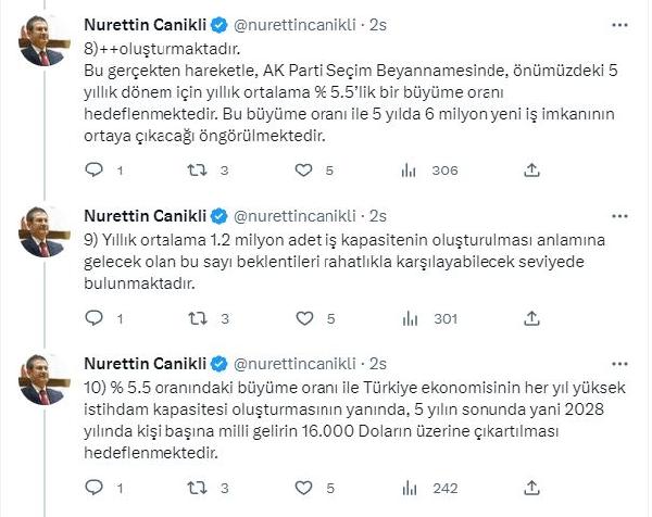 AK Parti'li Canikli, Twitter hesabından yaptığı açıklamada, "AK Parti'nin seçim beyannamesi ile vaat ettiği 2023-2028 döneminde yerine getirilmesi gereken yatırım ve harcamalar için kaynak problemi bulunmamaktadır. 7'li masa ise ekonomi hedefini Kemal Kılıçdaroğlu'nun İngiltere'den 300 milyar dolar kaynak getireceği; yani 300 milyar dolar borç alacağı beyanı ile ortaya koymaktadır. Gerçekçi bile olmayan bu vaadin, 300 milyar dolar tutarında bir borcun, uluslararası piyasadan sağlandığı bir an kabul edilse dahi bu borcun faizi ve kur farkı gideri, Türkiye'nin mali sistemini çökertecek boyutta olacaktır. AK Parti; seçim beyannamesi ile dengeli, gerçekçi ve iddialı ekonomi perspektifi ortaya koymaktadır. Bu gerçekten hareketle AK Parti; seçim beyannamesinde, önümüzdeki 5 yıllık dönem için yıllık ortalama yüzde 5,5'lik bir büyüme oranını hedeflemektedir. Bu büyüme oranı ile 5 yılda, 6 milyon yeni iş imkanının ortaya çıkması planlanmaktadır" dedi.