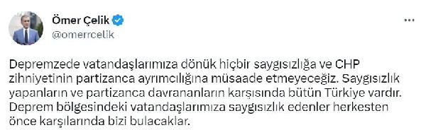 Kaan ULU/ ANKARA, (DHA)- AK Parti Genel Başkan Yardımcısı ve Parti Sözcüsü Ömer Çelik, "Depremzede vatandaşlarımıza dönük hiçbir saygısızlığa ve CHP zihniyetinin partizanca ayrımcılığına müsaade etmeyeceğiz" dedi.