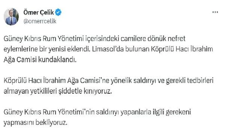 Kaan ULU/ANKARA, (DHA)- AK Parti Genel Başkan Yardımcısı ve Parti Sözcüsü Ömer Çelik, "Köprülü Hacı İbrahim Ağa Camisi'ne yönelik saldırıyı ve gerekli tedbirleri almayan yetkilileri şiddetle kınıyoruz. Güney Kıbrıs Rum Yönetimi'nin (GKRY) saldırıyı yapanlarla ilgili gerekeni yapmasını bekliyoruz" dedi.