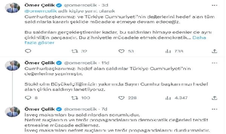 AK Parti Sözcüsü Ömer Çelik, sosyal medya hesabından yaptığı açıklamada, "Cumhurbaşkanımızı hedef alan saldırılar, Türkiye Cumhuriyeti’nin değerlerine yapılmıştır. Stokholm Büyükelçiliğimizin yakınında Sayın Cumhurbaşkanımızı hedef alan çirkin saldırıyı lanetliyoruz. İsveç makamları bu saldırılardan sorumludur. Nefret suçlarının ve terör propagandalarının demokratik değerleri tehdit etmesine müsaade edilemez. İsveç makamları nefret suçlarını ve terör propagandalarını durdurmalıdır. Cumhurbaşkanımızı ve Türkiye Cumhuriyeti’nin değerlerini hedef alan tüm saldırılarla kararlı şekilde mücadele etmeye devam edeceğiz. Bu saldırıları gerçekleştirenler kadar, bu saldırıları himaye edenler de aynı çirkinliğin parçasıdır. Bu zihniyetle mücadele etmek demokratik değerleri korumak için zorunludur" ifadelerini kullandı. (DHA)