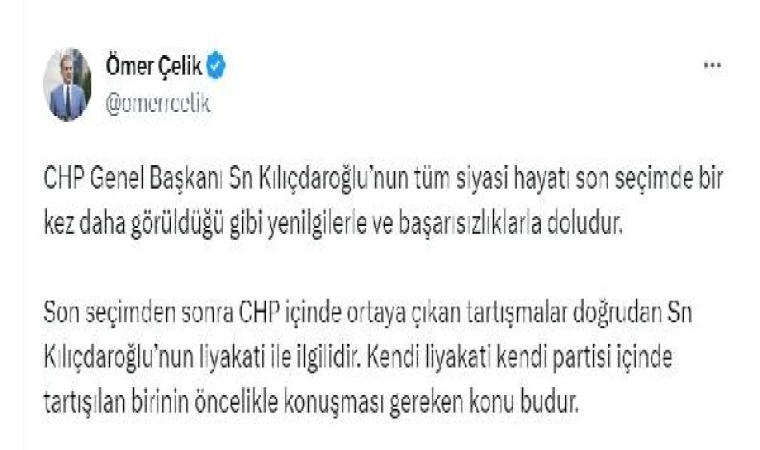 AK Parti'li Çelik, Twitter hesabından yaptığı açıklamada, "CHP Genel Başkanı Sayın Kılıçdaroğlu'nun tüm siyasi hayatı, son seçimde bir kez daha görüldüğü gibi yenilgilerle ve başarısızlıklarla doludur. Son seçimden sonra CHP içinde ortaya çıkan tartışmalar doğrudan Sayın Kılıçdaroğlu'nun liyakati ile ilgilidir. Kendi liyakati, kendi partisi içinde tartışılan birinin öncelikle konuşması gereken konu budur. Kendi partisi içinde liyakati tartışılan birinin, Cumhurbaşkanı'mızın siyasi liderliğini ve devlet yönetme liyakatini tartışması bir siyasi komedi örneğidir. Cumhurbaşkanı'mızın siyasi liderliği her seçimde yeni bir zirveye ulaşmakta ve devlet yönetmedeki yüksek liyakati Türkiye'nin hak ve menfaatlerini korumak için attığı her adımda bir kez daha görülmektedir" dedi. (DHA)