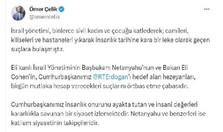 AK Parti Genel Başkan Yardımcısı da olan Çelik, sosyal medya hesabından yaptığı açıklamada, "İsrail yönetimi, binlerce sivil kadın ve çocuğu katlederek; camileri, kiliseleri ve hastaneleri yıkarak insanlık tarihine kara bir leke olarak geçen suçlara bulaşmıştır. Eli kanlı İsrail yönetiminin Başbakanı Netanyahu'nun ve Bakan Eli Cohen'in, Cumhurbaşkanımız Recep Tayyip Erdoğan'ı hedef alan hezeyanları, bir gün mutlaka hesap verecekleri suçlarını örtbas etme çabasıdır. Cumhurbaşkanımız insanlık onurunu ayakta tutan ve insani değerleri kararlılıkla savunan bir siyaset izlemektedir. Netanyahu ve benzerleri ise katliam siyasetinin takipçileridir" dedi. (DHA)