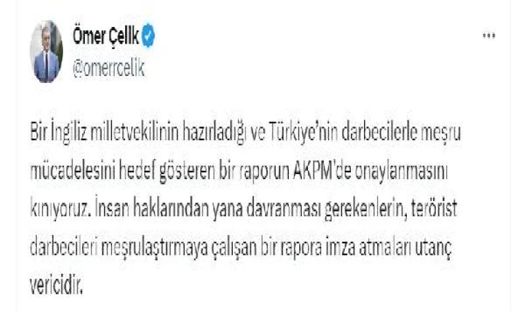ANKARA, (DHA)- AK Parti Genel Başkan Yardımcısı ve Sözcüsü Ömer Çelik, Avrupa Konseyi Parlamenter Meclisi’nde (AKPM) onaylanan rapora tepki göstererek, ”Türkiye’nin darbecilerle meşru mücadelesini hedef gösteren bir raporun AKPM’de onaylanmasını kınıyoruz. İnsan haklarından yana davranması gerekenlerin, terörist darbecileri meşrulaştırmaya çalışan bir rapora imza atmaları utanç vericidir” dedi.
