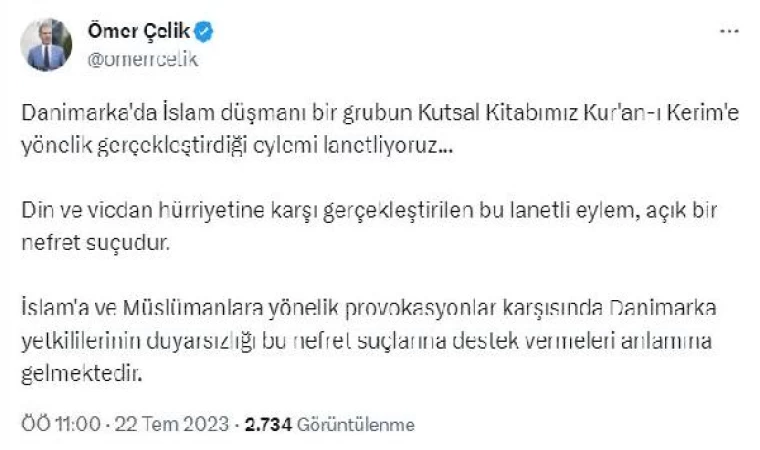 ANKARA, (DHA)- AK Parti Sözcüsü Ömer Çelik, Danimarka’da Kur’an-ı Kerim’e yönelik gerçekleştirilen eylemi kınadı.