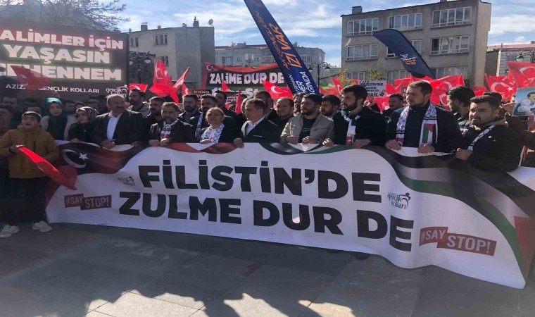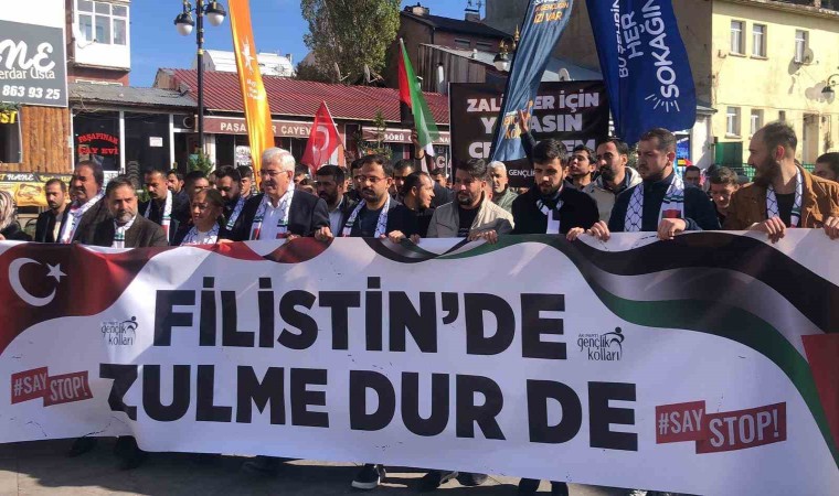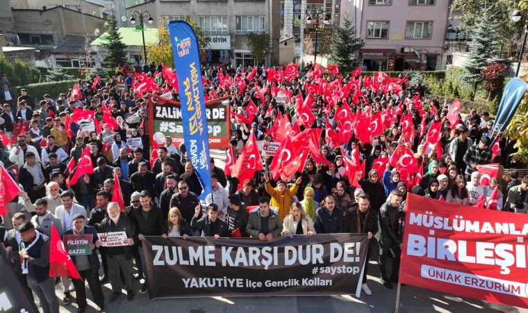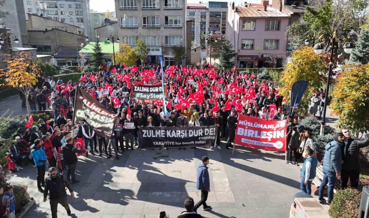 Burada bir basın açıklaması yapan AK Parti Gençlik Kolları Başkanı Muhammed Gökberk Kocaaliler, “Bugün burada Gazze’de, günler, günlerce yükselen acı tadilatlara akan onca masum kalan dökülen gözyaşlarına seyirci kalamayan mazlum ve masum coğrafyalar için her tarafta hakkı ve hakikati haykıran AK Parti Erzurum İl Gençlik Kolları Başkanlığı olarak SayStop demek üzere toplanmış bulunmaktayız. Bin dokuz yüz kırk sekiz yılından bu ya devam eden çatışmaların düşmüş bir hal aldı. Filistin’de katil ve zalim İsrail. Yedi Ekim’den Dibine küresel vicdanı derinden yaralayan çok sayıda sivil, can, kaybının yaşandığı yeni bir oluşturmuştur. Her karış toprağının yoğun bombardımanına tabi tutulduğu, orantısız gücün, savaşlarda dahi kullanımı yasak olan, fosfor bombalarının kullanıldığı en temel insan haklarının dahi insanlık onurunun ayaklar altına alındığı Filistin’de İsrail tarihe bir kez daha adını kara bir leke olarak yazdırmıştır. Gazi’deki yaşlı, çocuk, kadın, anasını, masum her bir sivilin su ve gıda dahil temel ihtiyaçları edinmelerini bile engelleyen zalim İsrail’in bu zulmü karşısında ne yazık ki sözde insan hakları savunucuları hatta kimileri vesaire destek için sıraya girmişlerdir. Saldırılarının ilk anından itibaren Cumhurbaşkanımız sayın Recep Tayyip Erdoğan tarafından kendilerine itidal çağrılarında bulunulan sükunete ve bu zalimliği sona erdirmeye ve çağırılan bunun dışında aradığı her yolun ve hevesin peşinde koşulmasının sadece daha fazla yıkıma, daha fazla göz yaşına ve daha fazla can kaybına sebep olacağı kendisine ısrarla hatırlatılan İsrail’deki tüm bu daha fazla masum kanı dökerek yanıt vermiştir” diye konuştu.