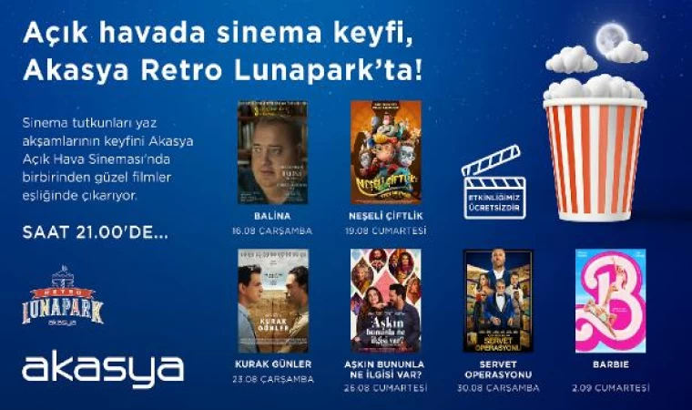Akasya Akasya Açık Hava Sineması, 16 Ağustos-2 Eylül tarihleri arasında her çarşamba ve cumartesi saat 21.00’de ücretsiz gerçekleşecek film gösterimleri ile sinemaseverleri Akasya Retro Lunapark’ta ağırlayacak. İlk gösterimi Balina ile başlayan etkinliğin bu yılki programında Neşeli Çiftlik, Kurak Günler, Aşkın Bununla Ne İlgisi Var?, Servet Operasyonu ve Barbie gibi sinema dünyasında ses getiren dikkat çekici filmler yer alıyor. Akasya Açık Hava Sineması’nda gösterimlerden önce canlı dj performansları da gerçekleştirilecek.