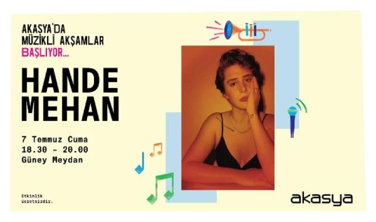Akasya AVM, temmuz ve ağustos aylarında her Cuma akşamı "Müzikli Akşamlar" etkinliğine ev sahipliği yapacak. İlk etkinlik 7 Temmuz Cuma günü Akasya Güney Meydanı'nda gerçekleşecek ve ücretsiz olacak. Bu konserde, alternatif popun genç yeteneği Hande Mehan sahne alarak müzikseverlere unutulmaz bir deneyim sunacak.