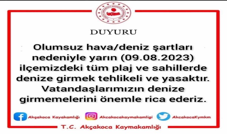 Meteoroloji İşleri Genel Müdürlüğün hava tahminlerinde Düzce’de yarından itibaren sıcak havanın yerini rüzgarlı ve yağışlı havaya bırakacağını açıklamasının ardından Düzce’nin ve Anadolu’nun denize açılan kapısı Akçakoca ilçesinde kaymakamlık kararıyla denize girmek yasaklandı. Kaymakamlığın sosyal medya hesaplarından yapılan açıklamada “Olumsuz hava/deniz şartları nedeniyle 09.08.2023 günü ilçemizdeki bütün plaj ve sahillerde denize girmek tehlikeli ve yasaktır. Vatandaşlarımızın denize girmemeleri rica olunur.” ifadelerine yer verildi.
