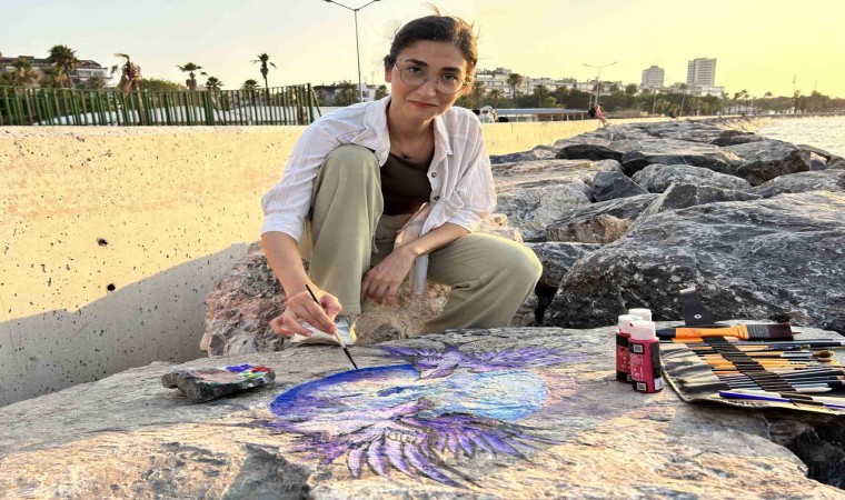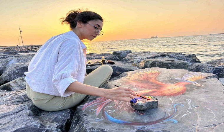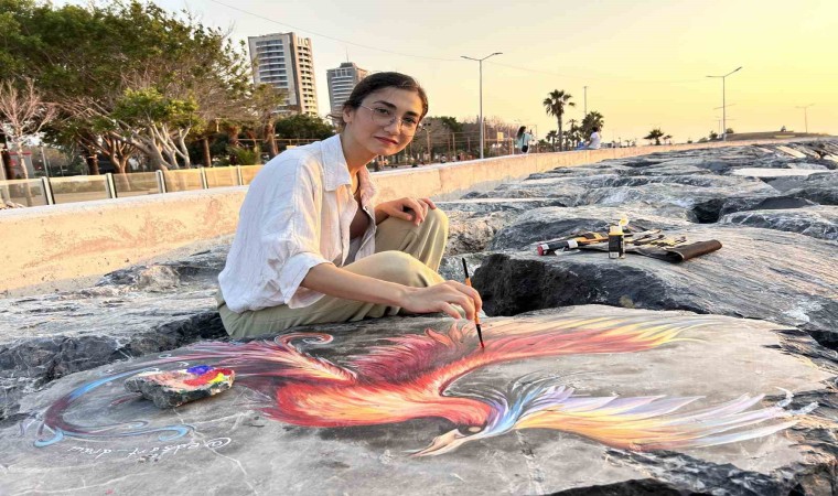 Hatay’da İskenderun körfezindeki kayalara Zümrüdüanka kuşu çizen ressam Edanur Sarar, çalışmalarıyla sahile renk kattı.