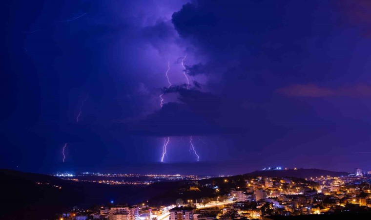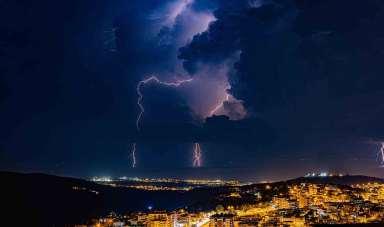 Hatay’da akşam saatlerinde etkili olan yağışlı birlikte kendini gösteren şimşekler, İskenderun Körfezi’nde geceyi aydınlattı.