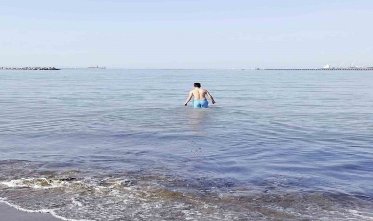 Hatay’ın Payas ilçesinde bir vatandaş, yağışlı havanın ardından günler sonra açan güneşi fırsat bilerek denizde yüzdü.