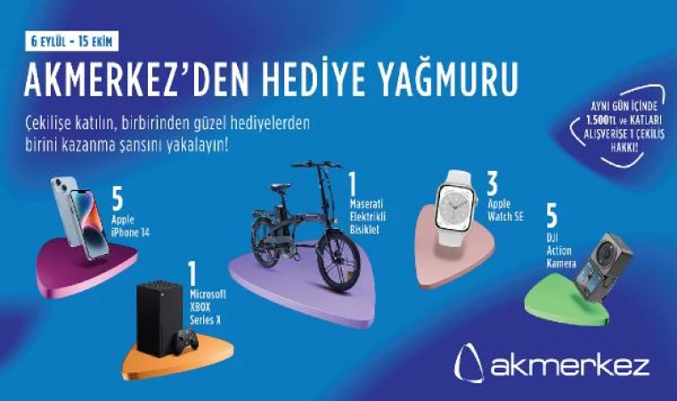 “6 Eylül ile 15 Ekim tarihleri arasında alışveriş yapan tüm ziyaretçiler birbirinden güzel hediyelerden birini kazanma şansına sahip olacaklar. Akmerkez ziyaretçileri, bin 500 lira ve katları değerinde alışveriş yaparak çekilişe katılarak 15 farklı hediye arasından birini kazanma fırsatı elde edebilirler. Çekilişte; 5 adet iPhone 14, 5 adet DJI Action kamera, 3 adet Apple Watch SE, 1 adet Maserati elektrikli bisiklet ve 1 adet Microsoft XBOX kazanma şansı, Akmerkez misafirlerini bekliyor. Akmerkez'in hediye şöleninin bir parçası olma fırsatını kaçırmamanızı öneririz.”