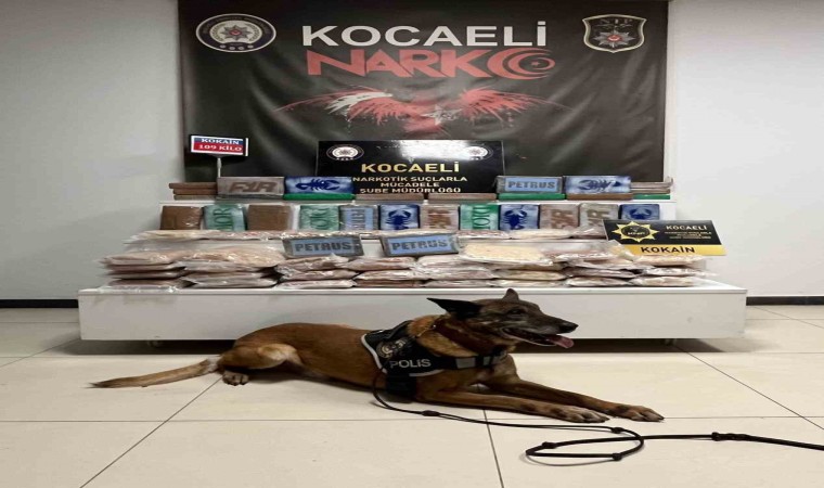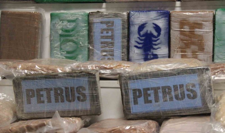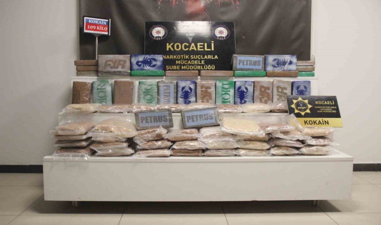 Öte yandan, ele geçirilen 109 kilogram kokain, Kocaeli İl Emniyet Müdürlüğünde sergilendi. Kokain paketlerinin bazılarının üzerinde akrep figürü olduğu görüldü.