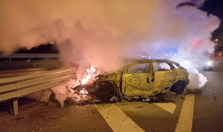 Aksaray’da bariyerlere çarparak duran otomobilde 3 kişi yaralandı. Kaza sonrası alev alev yanan araç demir yığınına döndü.