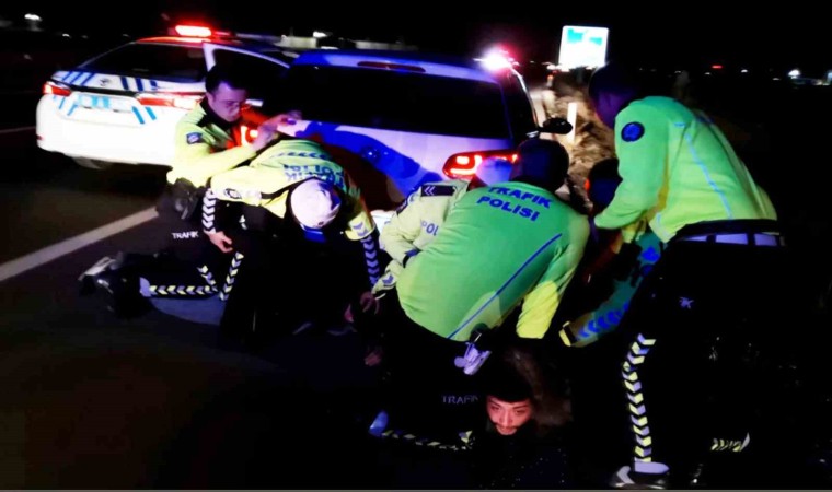 Olay, dün gece yarısı şehir merkezinde yaşandı. Edinilen bilgiye göre, kent merkezinde uygulama yapan polis ekipleri şüphe üzerine 68 AEA 216 plakalı otomobil sürücüsüne ‘dur’ ihtarında bulundu. Sürücü polisin ikazına uymayarak uygulama noktasından kaçarken polis ekipleri de aracın peşine düştü. Ara sokaklara girerek polis ekiplerinden kaçmaya çalışan sürücü ile polis arasında amansız bir kovalamaca başladı. Ekiplerin araç plakasını, modelini ve istikametini telsizden anons etmesi üzerine Aksaray emniyeti adeta alarma geçti. Şehir merkezi sokaklarında yankılanan siren sesleri aracın Aratol Mahallesine girmesiyle Konya karayoluna kadar yükseldi. Polisten kaçmak için ters yola da giren araç sürücüsü trafikte büyük tehlike oluşturdu. Yaklaşık 14 ekip aracının takip ettiği kovalamacada araziye giren otomobilin lastiklerine polis ekiplerince ateş açıldı. Buna rağmen kaçmayı sürdüren otomobil araziden Aksaray - Konya Karayolu’na çıktı. Kurşunun isabet ettiği sağ ön lastiğin tamamen parçalanması üzerine daha fazla kaçamayan sürücü karayolunda İl Emniyet Müdürlüğü Trafik Tescil ve Denetleme Şubesi ekiplerince kıskıvrak yakalandı.