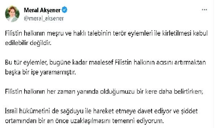 ANKARA, (DHA)- İYİ Parti Genel Başkanı Meral Akşener, "Filistin halkının meşru ve haklı talebinin terör eylemleri ile kirletilmesi kabul edilebilir değildir. Bu tür eylemler, bugüne kadar maalesef Filistin halkının acısını artırmaktan başka bir işe yaramamıştır" dedi.