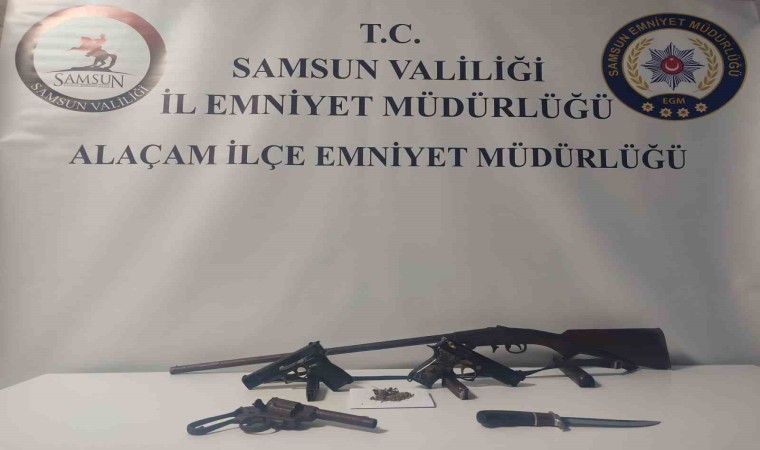 Samsun’un Alaçam ilçesinde 2 ayrı adreste yapılan aramada ruhsatsız av tüfeği, kama, uyuşturucu ve kurusıkı tabanca ele geçirildi.