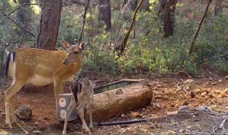 Alageyik ve yavrusu, su içerken fotokapana yakalandı