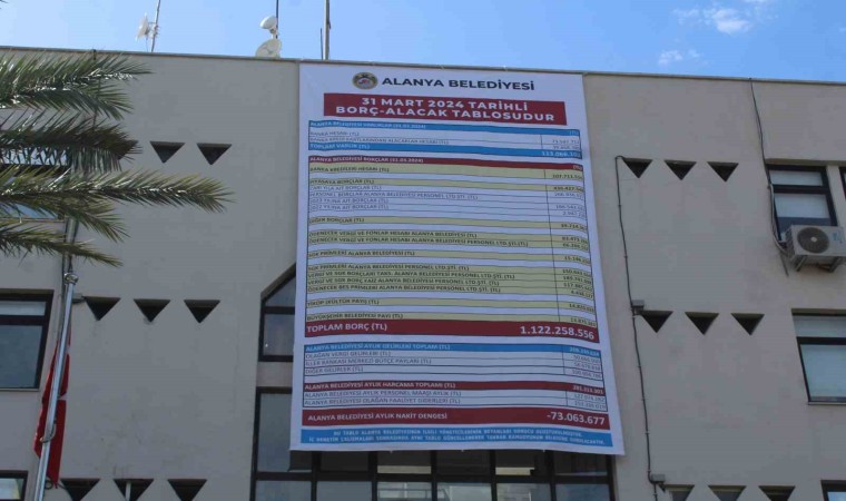 Alanya Belediye Başkanı Osman Tarık Özçelik, 31 Mart Yerel Seçimleri sürecinde vaat olarak borç bakiyesi ve aylık gelir gider dengesini gösteren mali tabloyu göstermişti. Başkan Özçelik, verdiği sözü tutarak belediyenin borç listesini ve aylık gelir gider dengesi afişini ana binaya astı. Asılan listeye göre Alanya Belediyesi’nin kısa vadede ödenmesi gereken toplam borcu 1 milyar 122 milyon 258 bin 556 lira.