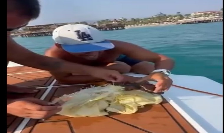 Antalya’nın Alanya ilçesinde denizde çuvala dolanan ve su üzerinde kıvranan caretta caretta yavrusu, bir teknedeki vatandaşlar tarafından kurtarıldı. Kurtarma anı cep telefonu kamerasına yansıdı.