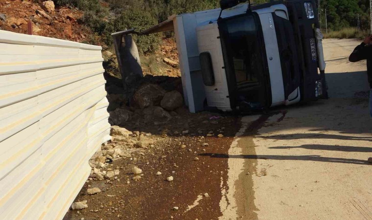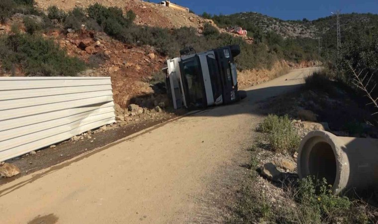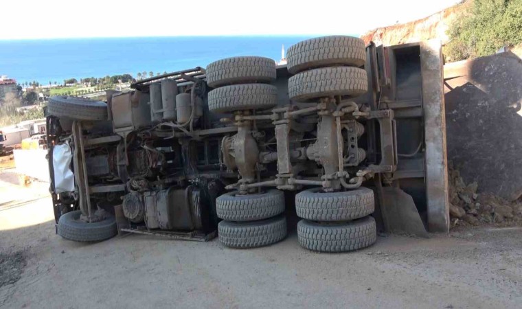 Antalya’nın Alanya ilçesinde bir inşaat şantiye alanı için çalışan kamyon yan yattı, sürücü hafif yaralandı.