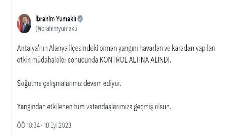 Tarım ve Orman Bakanı İbrahim Yumaklı, yangına ilişkin sosyal medya hesabından açıklama yaptı. Yumaklı, "Antalya'nın Alanya ilçesindeki orman yangını havadan ve karadan yapılan etkin müdahaleler sonucunda kontrol altına alındı. Soğutma çalışmalarımız devam ediyor. Yangından etkilenen tüm vatandaşlarımıza geçmiş olsun" dedi. (DHA)