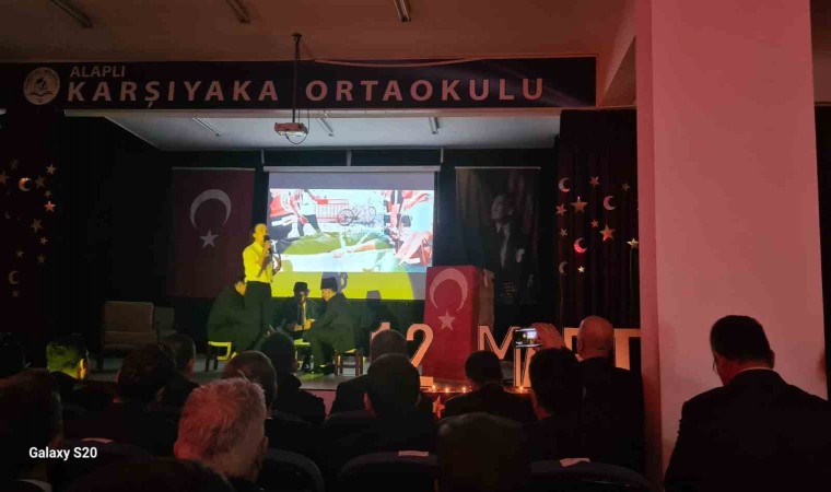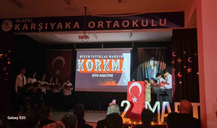 Alaplı Karşıyaka Ortaokulu öğretmenleri ve öğrencileri tarafından düzenlenen 12 Mart İstiklal Marşı’nın Kabulü ve Mehmet Akif Ersoy’u Anma Günü programı; saygı duruşu ve akabinde İstiklal Marşı’nın okunmasıyla başladı. Günün anlam ve önemini belirten konuşmaların yapılmasından sonra öğrencilerin hazırladığı ve oynadığı tiyatro gösterisi sahnelendi. Burada gazetecilere açıklamada bulunun Alaplı Kaymakamı Selçuk Köksal, 12 Mart İstiklal Marşı’nın Kabulü ve Mehmet Akif Ersoy’u Anma Günü nedeniyle Alaplı Karşıyaka Ortaokul öğretmenleri ve öğrencileri tarafından bir program düzenlendiğini belirterek, “Çok güzel bir program oldu. Allah bir daha bu millete İstiklal Marşı yazdırmasın. Allah’ın izni ile asımın nesli bu ülkeyi Mehmet Akif Ersoy’un özlediği şekilde yönetecek ve uygar milletler seviyesine çıkaracak” dedi.