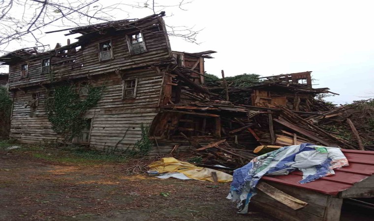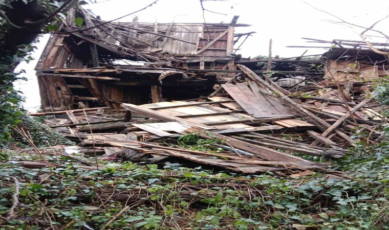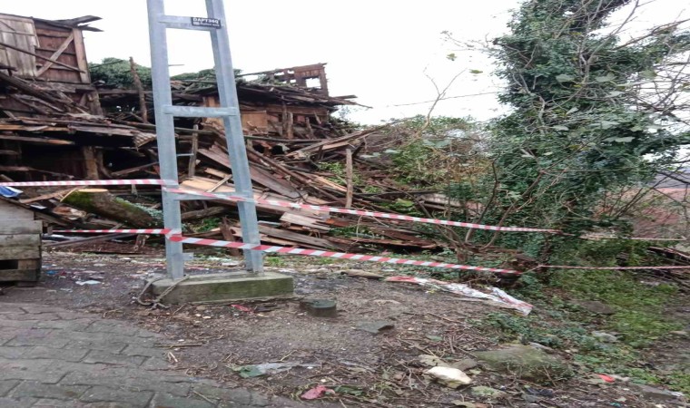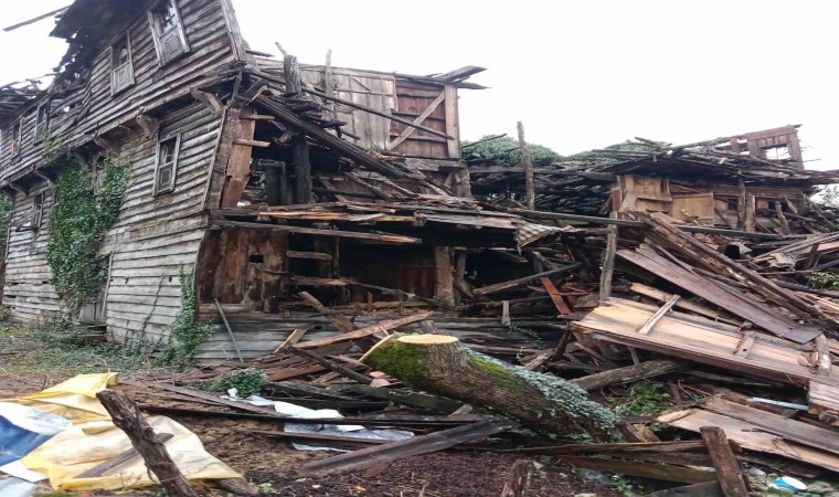 Zonguldak’ın Alaplı ilçesine bağlı Büyük Tekke köyünde terk edilmiş 100 yıllık ahşap ev fırtına nedeniyle yıkıldı.