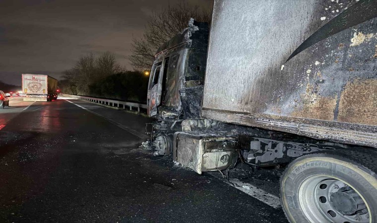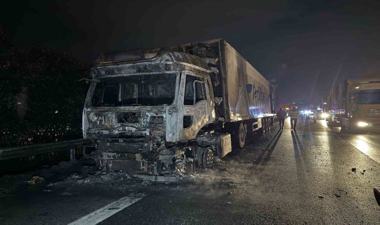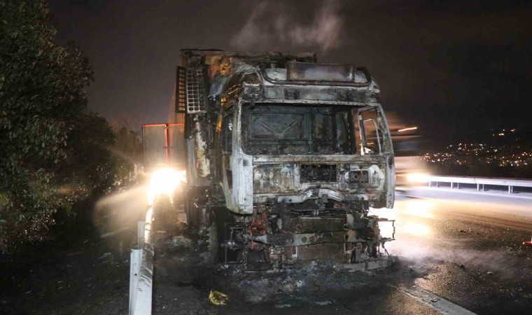 Anadolu Otoyolu Kocaeli geçişinde alev alev yanan muz yüklü tırın çekici bölümünden geriye demir yığını kaldı.