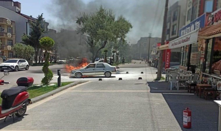 Balıkesir’in Bandırma ilçesinde alev alev yanan otomobil küle dönerken, sürücü kendini zor dışarı attı.