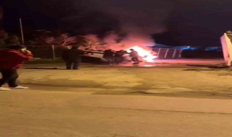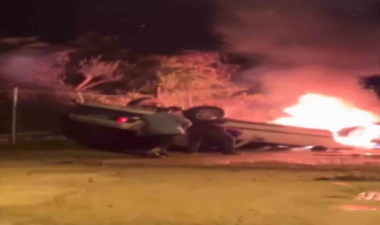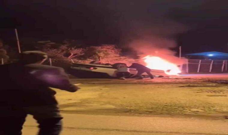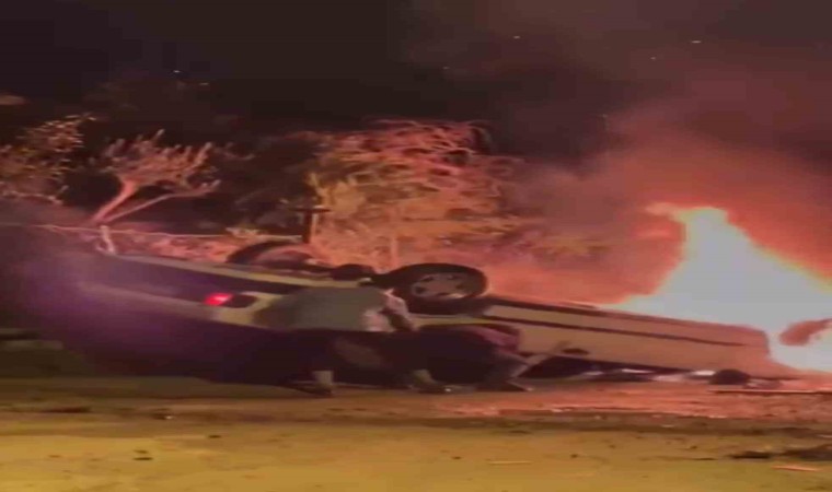 Bursa’da kavşağa hızla girip takla atan araç alev alev yanarken, sürücüyü bir vatandaşın canını tehlikeye atarak çıkardığı anlar kameraya yansıdı.