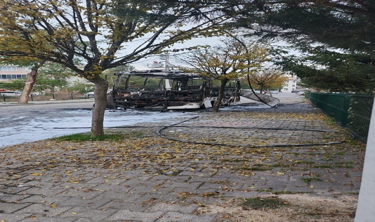 Bolu’da alev topuna dönen park halindeki minibüsten geriye iskeleti kaldı.
