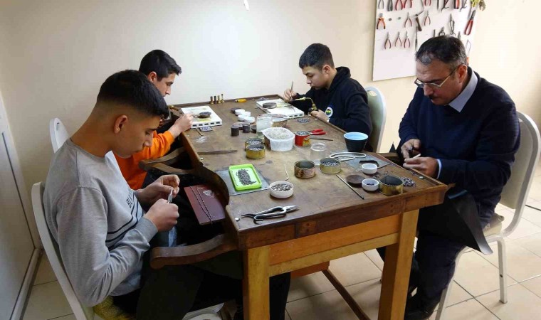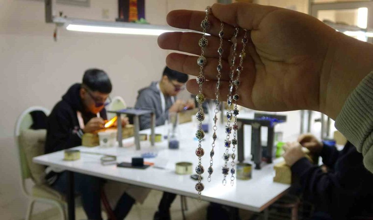 3 aydır atölyede çalıştığını söyleyen öğrencilerden Yusuf Arslan da, “Şehit Ferhat Gökdemir Mesleki ve Teknik Anadolu Lisesinde Takı İmalatı ve Kuyumculuk bölümünde okuyorum. Okulda aldığımız teorik bilgileri bu atölyede uygulamaya döküyoruz. Burada camdan boncuklar üretiyoruz, gümüş bölümünde de bileklik ve kolye yapıyoruz. Burada yaptığımız ürünler yurt dışına gidiyor ben de atölyede çalışarak aile bütçeme katkı sağlıyorum” dedi.