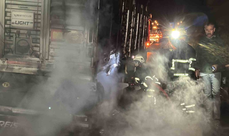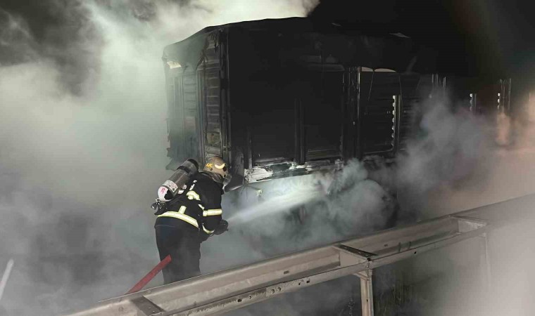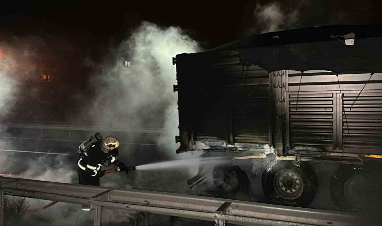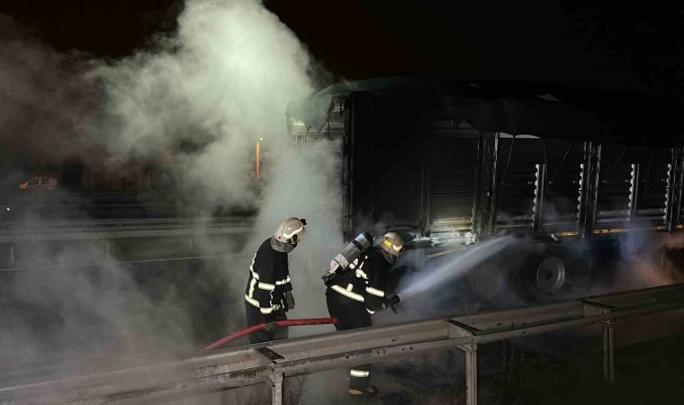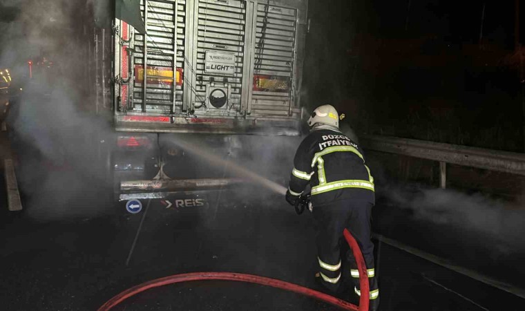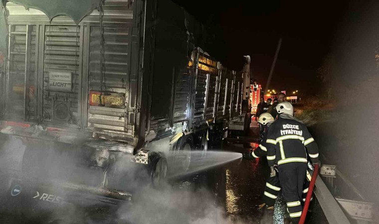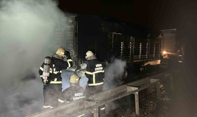 Düzce’de lastiklerinden tutuşan tırın dorsesindeki yangın itfaiye ekiplerince söndürüldü.