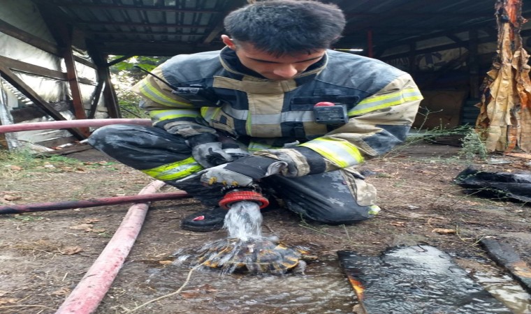 Kocaeli’nin Dilovası ilçesinde ağaçlık alanda çıkan yangında, alevlerin arasında kalan kaplumbağa itfaiye ekiplerince kurtarıldı.