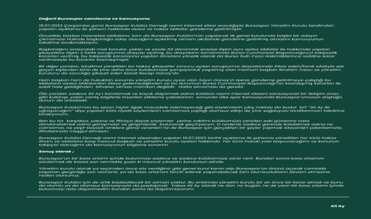 Ali Ay ayrıca, “Bursaspor Kulübü’nün bu sezon hiçbir ligde mücadele edemeyeceği gibi söylemlerin çıkış noktası da budur. Sırf ’Ali Ay ile uğraşacağım’ diye yapılan kötü niyetli söylemlerin camiamıza yaptığı olumsuz etkiyi de yine sağduyulu taraftarımızın takdirine bırakıyorum. Ben bu tür karşılıksız, yalana ve iftiraya dayalı söylemler yerine vaktimi kulübümüzü yeniden eski günlerine nasıl döndürebilmek adına görüşmeler ve girişimlerde bulunarak geçiriyorum. O nedenle sadece görevde kalabilmek adına ne camiamızı, ne yeşil-beyazlı renklere gönül verenleri ne de Bursaspor için gerçekten bir şeyler yapmak isteyenleri yalanlarınızla, iftiralarınızla meşgul etmeyin. Bursaspor Kulübü Derneği resmi internet sitesinden yapılan 19.07.2023 tarihli açıklama ile şahsıma yöneltilen her türlü haksız itham ve iddialara karşı mevcut başkan ve yönetim kurulu üyeleri hakkında her türlü hukuki yola başvuracağımı ve konunun takipçisi olacağımı da kamuoyunun bilgisine sunarım” İfadelerini kullandı.