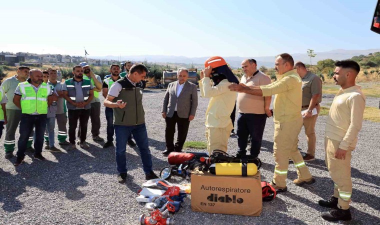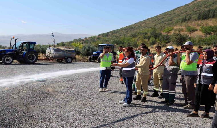 Konuşmaların ardından 35 belediye personeline yangında kullanılacak araç gereç ve ekipman tanıtılarak, yangın söndürme hortumuyla uygulamalı olarak eğitim verildi.
