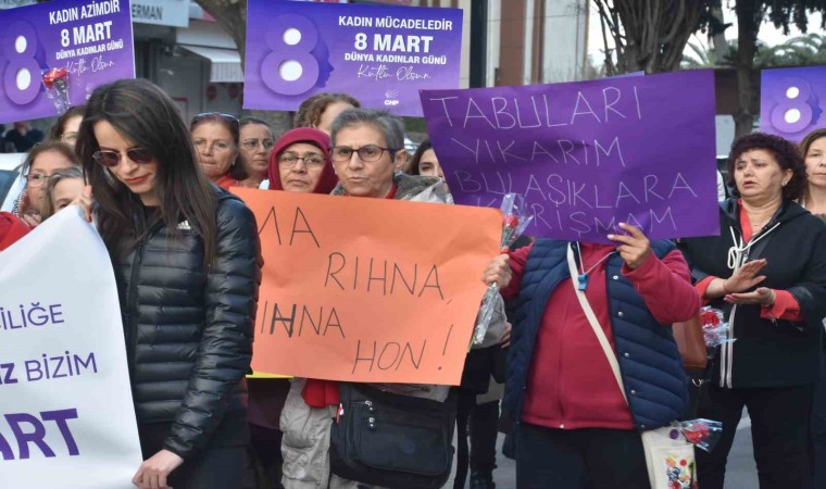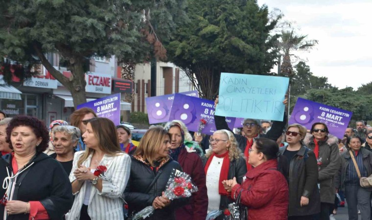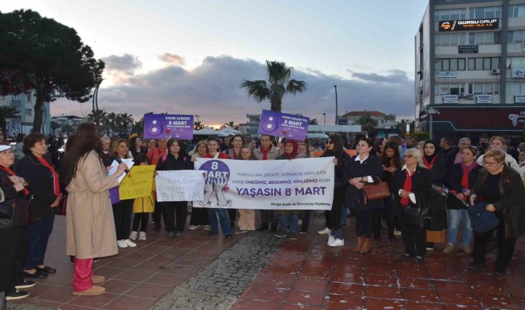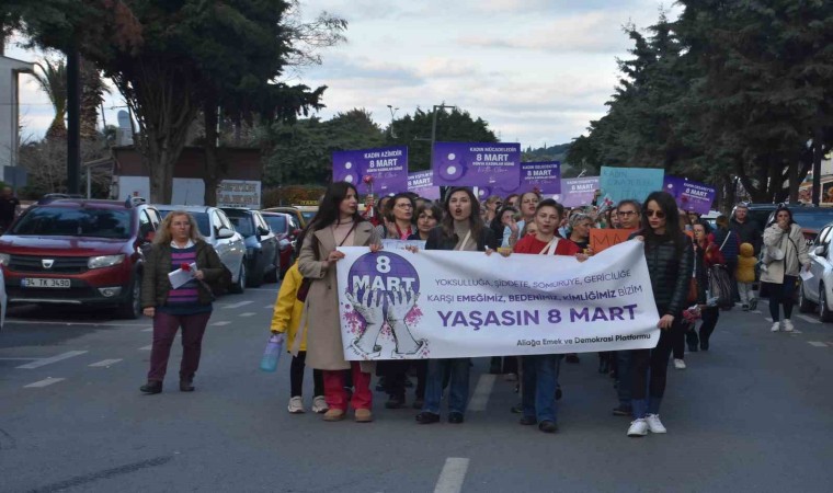 İzmir’de Aliağa Emek ve Demokrasi Platformu, 8 Mart Dünya Emekçi Kadınlar Günü dolayısıyla bir araya geldi. Demokrasi Meydanı’nda toplanan kalabalık, önce yürüyüş gerçekleştirdi daha sonra ise basın açıklaması yaptı. Yürüyüşte ’yoksulluğa, şiddete, sömürüye, gericiliğe karşı, emeğimize, bedenimize, kimliğimize sahip çıkıyoruz, yaşasın 8 Mart’ pankartı açıldı ve ’kadın, yaşam, özgürlük’, ’kadınlar yürüyor mücadele büyüyor’, ’yaşasın kadın dayanışması’ sloganları atıldı.