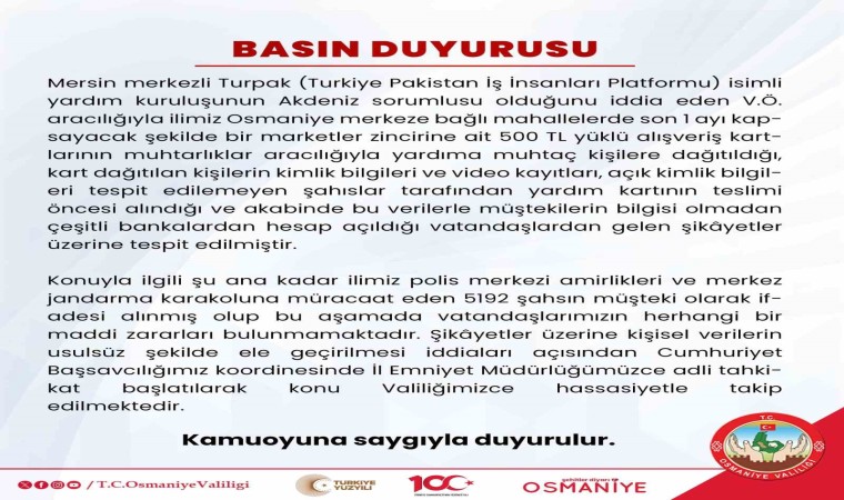 Konuyla ilgili yazılı açıklama yapan Osmaniye Valiliği, “Mersin merkezli Turpak (Türkiye Pakistan İş İnsanları Platformu) isimli yardım kuruluşunun Akdeniz sorumlusu olduğunu iddia eden V.Ö. aracılığıyla ilimiz Osmaniye merkeze bağlı mahallelerde son 1 ayı kapsayacak şekilde bir marketler zincirine ait 500 TL yüklü alışveriş kartlarının muhtarlıklar aracılığıyla yardıma muhtaç kişilere dağıtıldığı, kart dağıtılan kişilerin kimlik bilgileri ve video kayıtları, açık kimlik bilgileri, tespit edilemeyen şahıslar tarafından yardım kartının teslimi öncesi alındığı ve akabinde bu verilerle müştekilerin bilgisi olmadan çeşitli bankalardan hesap açıldığı vatandaşlardan gelen şikayetler üzerine tespit edilmiştir. Konuyla ilgili şu ana kadar ilimiz polis merkezi amirlikleri ve merkez jandarma karakoluna müracaat eden 5 bin 192 şahsın müşteki olarak ifadesi alınmış olup bu aşamada vatandaşlarımızın herhangi bir maddi zararları bulunmamaktadır. Şikayetler üzerine kişisel verilerin usulsüz şekilde ele geçirilmesi iddiaları açısından Cumhuriyet Başsavcılığımız koordinesinde İl Emniyet Müdürlüğümüzce adli tahkikat başlatılarak konu Valiliğimizce hassasiyetle takip edilmektedir” denildi.