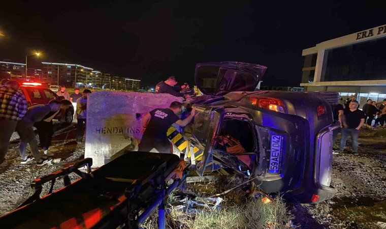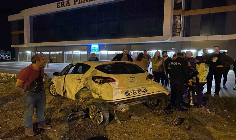 Tekirdağ Çorlu’da alkollü sürücünün kullandığı otomobil, seyir halindeki motosiklete ve otomobile daha sonra park halindeki otomobil ile beton büze çarparak devrildi. 3 kişinin yaralandığı kaza, anbean kameraya yansıdı.